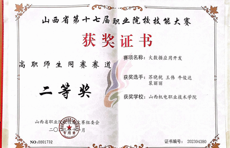 2023年11月11日,山西省第十七届职业院校技能大赛大数据应用开发赛项在山西工程职业学院举办,我系大数据技术专业裴丽丽、史媛老师以及6名学生参赛。该赛项为师生同赛,每组1名教师和3名学生。